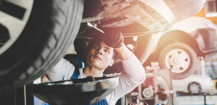 - Vanligvis heiser man opp bilen, men du kan fint krype under. Husk å sikre bilen godt før du legger deg under. Legg deg aldri under en bil som bare holdes oppe av en jekk – bruk alltid en akselstøttebukk.